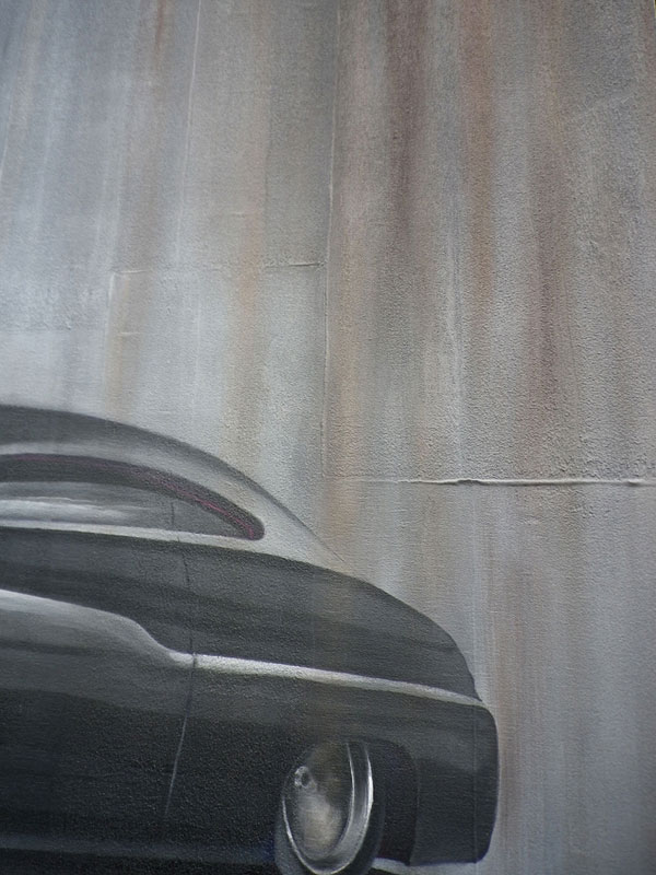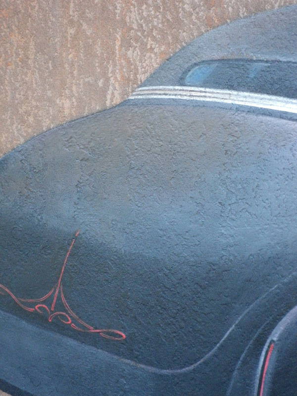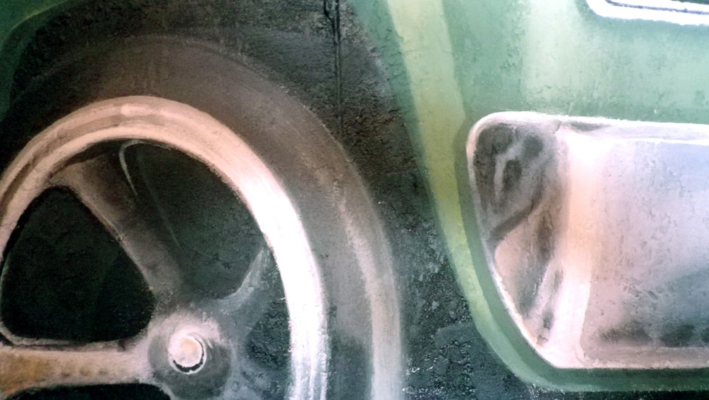 Następne płótno po kilku dniach walki pokryło się imitacją rdzy, teraz wezmę Buicka od przodu, chciałem mu zrobić hardcorowy grill, i wyszło mi na symulacji fotoszopowej, że taki "obstrzępiony" jest najbardziejszy